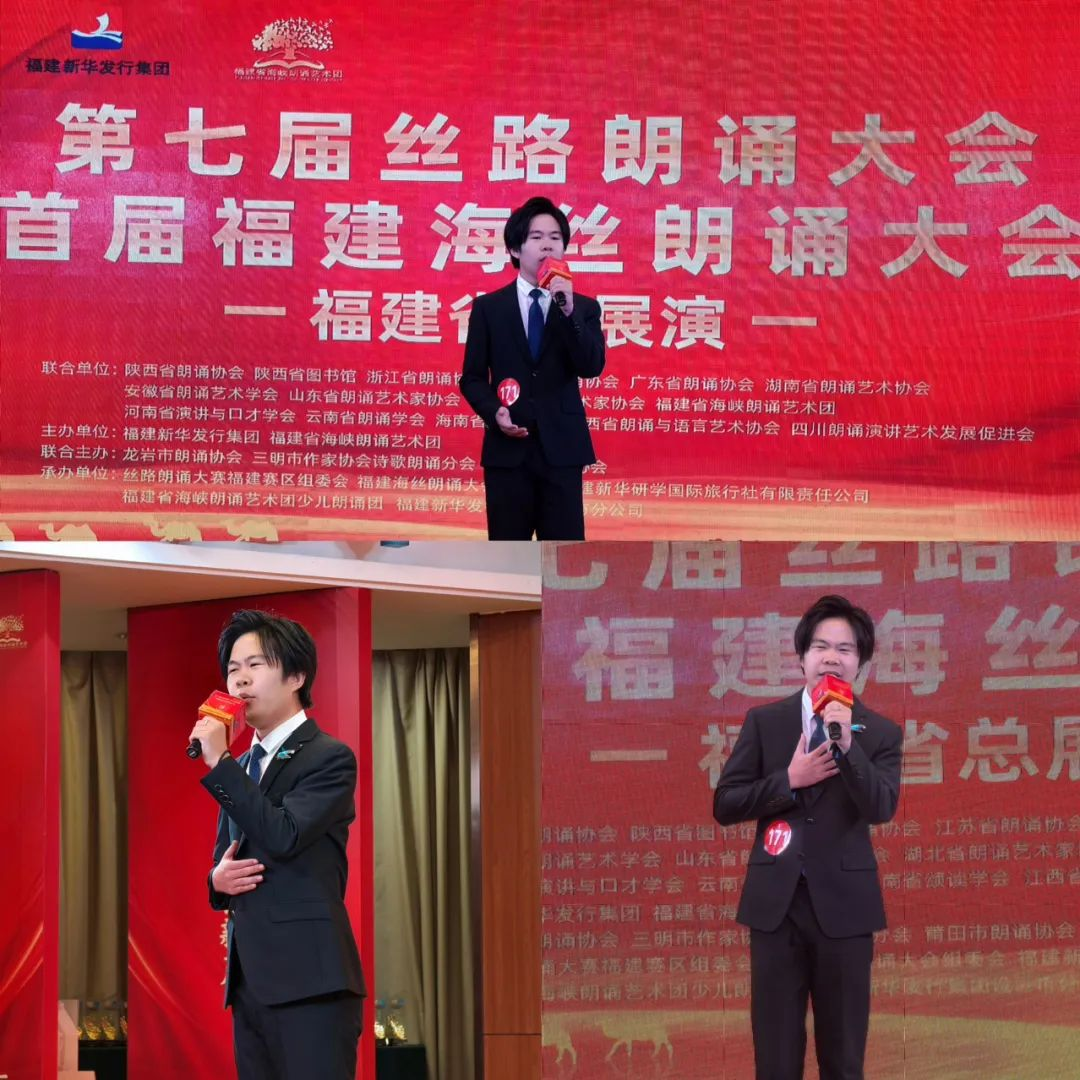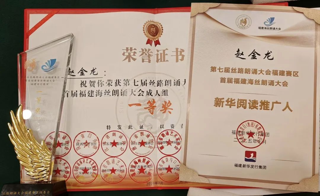 7月6日上午,由福建等十余个“一带一路”沿线省份的省级朗诵协会和图书馆联合发起,福建新华发行集团和福建省海峡朗诵艺术团共同主办的第七届丝路朗诵大会福建赛区·首届福建海丝朗诵大会在福州举办。来自成人影视2023级的赵金龙同学在成人组中脱颖而出,以一篇《岳阳楼记》荣获一等奖,并被主办方之一福建新华发行集团授予“新华阅读推广人”称号。