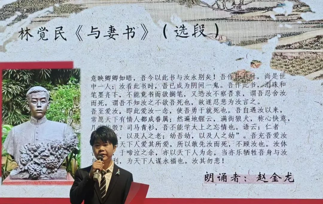 此外,今年4月,在“福小宣·家风家教与党规党纪”主题宣讲活动中,赵金龙同学作为青年文艺工作者现场演绎《与妻书(选段)》;后受聘为三坊七巷名人家风家训馆讲解员,三坊七巷“闽都家风少年”礼仪导师。
