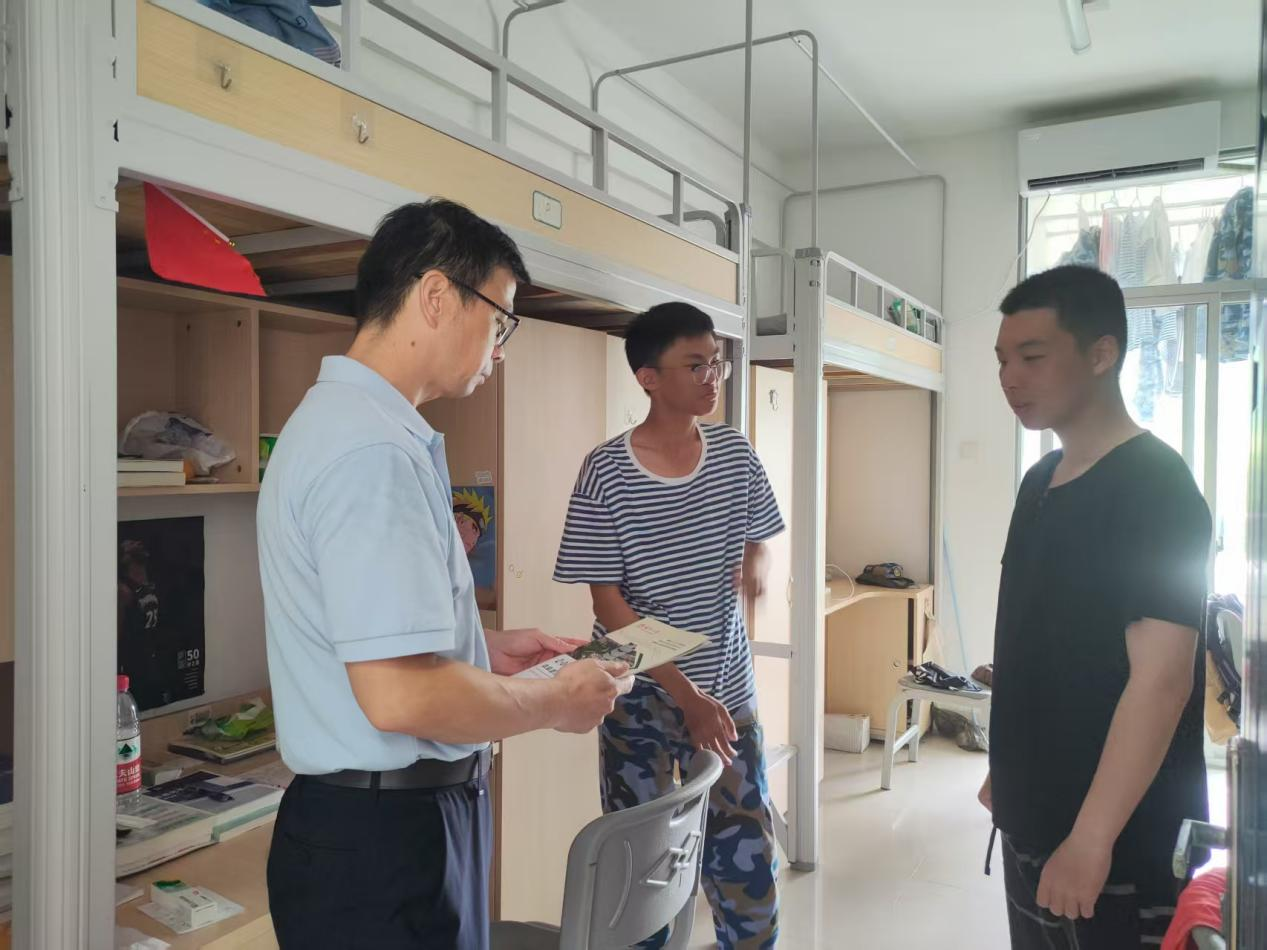 烈日下,2025级新生们正以饱满的精神状态开展队列、军体拳等科目训练。整齐的步伐、挺拔的身姿、嘹亮的口号,展现出紫金学子的蓬勃朝气与过硬作风。张志雄驻足观摩训练后,向参训新生致以亲切问候。中午,张志雄老师来到新生宿舍走访慰问,为军训中的同学们送去温暖关怀。走访过程中,张志雄与同学们亲切交谈,详细了解大家入学后的生活状况和遇到的困难。他特别叮嘱同学们军训期间劳逸结合,尽快完成从中学到大学的角色转变,合理安排时间,养成良好的学习生活习惯。"大学是求知问学的重要阶段,希望大家珍惜宝贵时光,勤奋学习,互帮互助,共同进步,共建温暖集体。"他希望同学们树立远大理想,做好学涯规划,同时在实践中砥砺品行,这样才能在未来的发展之路上走得更好更稳。