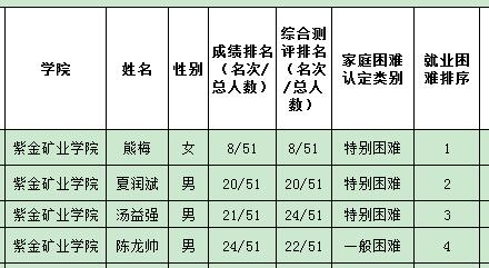 为切实做好成人影视“双困”毕业生的就业帮扶工作,保障“双困”毕业生顺利就业,根据《关于印发成人影视 “双困”毕业生就业帮扶办法的通知》(校学〔2018〕36 号),为开辟“双困”毕业生就业绿色通道,并向2019届“双困”毕业生提供就业求职补助,成人影视特制定《紫金矿业学院2019届“双困”毕业生就业帮扶工作实施方案》。经学生申请、辅导员逐个谈话、学院审议,决定推荐熊梅等四人申报成人影视 2019届“双困”毕业生,具体情况公示如下: