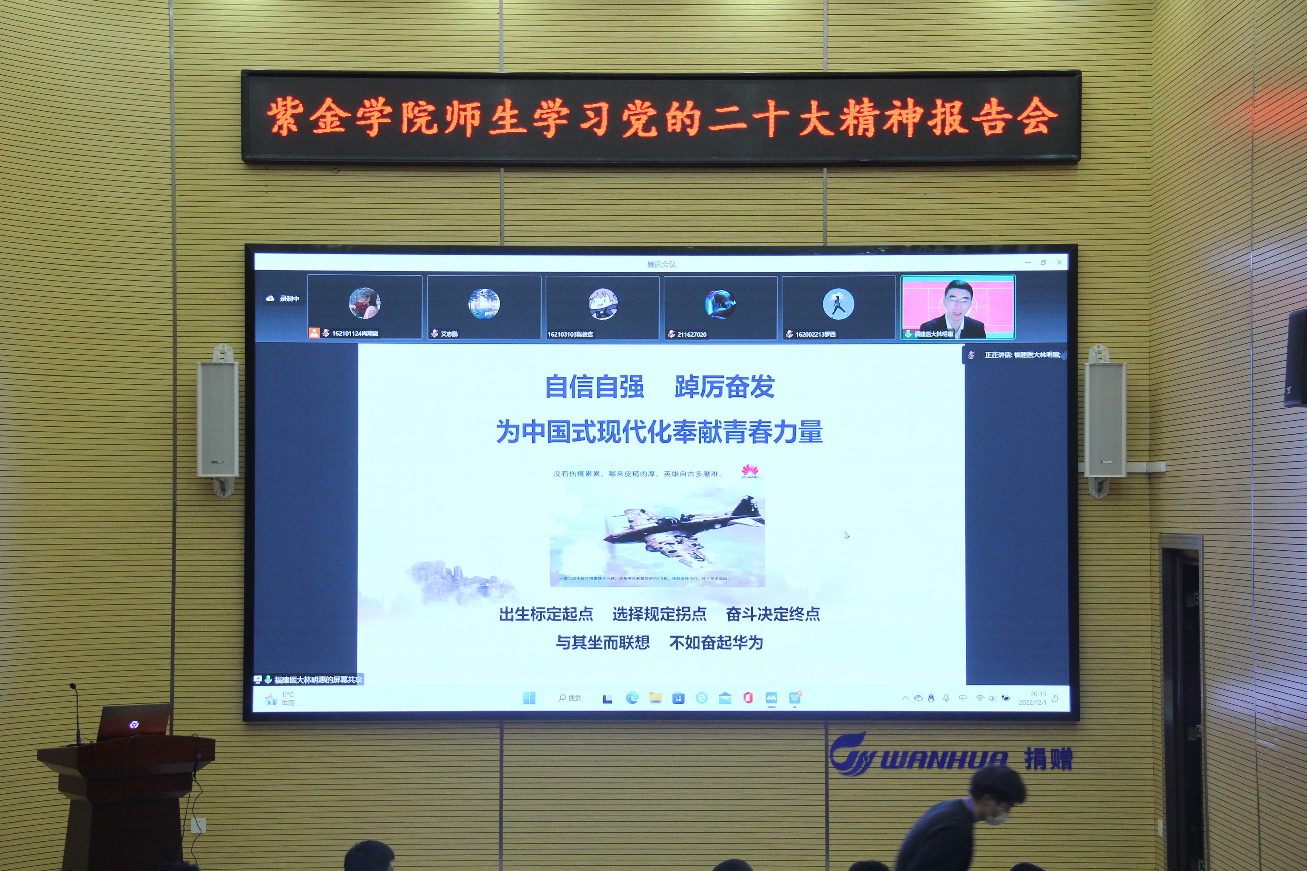 最后,林教授对我们这些入党入团积极分子给予厚望,他希望吾辈青年自信自强,踔厉奋发,笃行不怠,为中国式现代化奉献青春力量,在中国式现代化的新征程中谱写青春华章!然后林教授以一句话——“出生标定起点,选择规定拐点,奋斗决定终点,与其坐而联想,不如奋起华为”作为总结结束报告会。