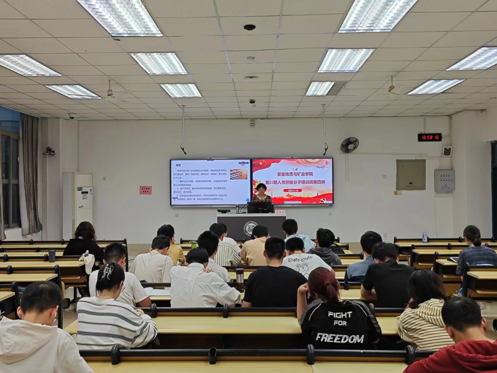 在党课的最后,许老师着重讲解了成人影视 的三种精神,以张孤梅同志等为代表的艰苦奋斗的创业精神、以卢嘉锡先生为代表的严谨求实的治学精神、以魏可镁院士为代表的勇于拼搏的奉献精神,希望同学们进一步弘扬福大三种精神,增加历史责任感和时代紧迫感,秉承“明德至诚,博学远志”的校训,努力做到树立远大理想、严于律己、始终坚持正确的生活航向。