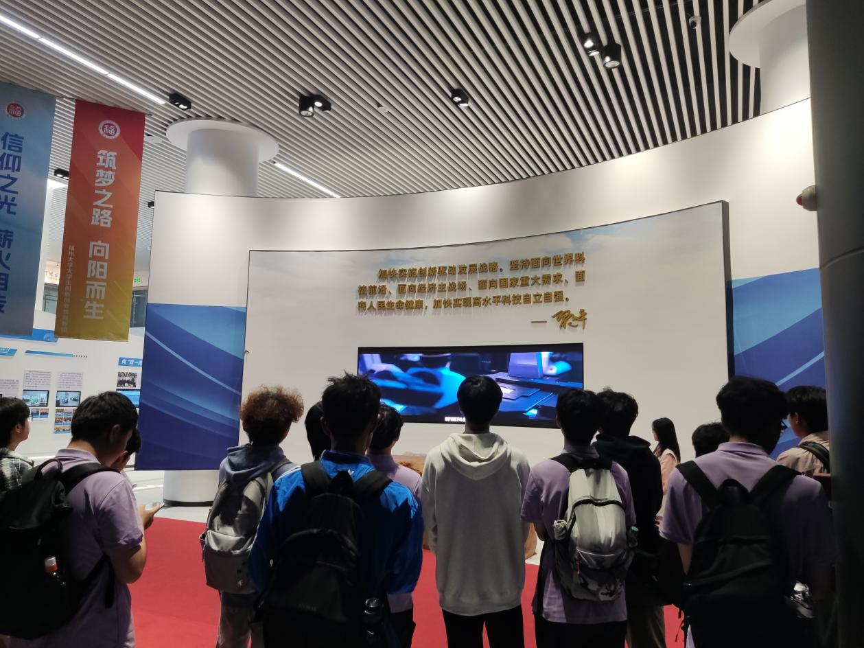 充满现代活力的学生创新创业教育展馆,为新生们打开了眺望未来的窗口。同学们在讲解员的带领下,依次参观了“序厅”、“第一章: 信仰之光,薪火相传”、“第二章: 筑梦之路,向阳而生”、“第三章: 报国之志,顶天立地”以及“尾厅” 五个展厅。在这里,学校服务国家重大战略的科研实践与学生们“敢闯会创”的鲜活案例交相辉映。