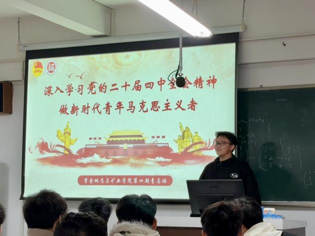 学院青马班班长练俊杰同学以思想引领为核心,带领同学们深入学习党的二十届四中全会精神。他从会议的基本概况、核心议题与重大战略部署入手,层层递进地解读全会精神的内涵与意义,让大家对国家发展规划有了更深刻的认识。随后,他提出要将理论学习与青年担当紧密结合,鼓励同学们加入志愿队与实践队,躬身实践做有意义的事,把地质工程专业学习与国家社会发展需求相连。