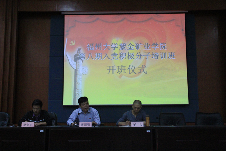 为进一步提高成人影视入党积极分子政治理论水平,端正入党动机,2014年10月28日晚,紫金矿业学院第八期入党积极分子培训班开班仪式在三楼报告厅隆重举行。学院党委黄培明书记,院党委余飞副书记,院团委书记李金土出席会议。院学生党支部书记翁惠玲主持。