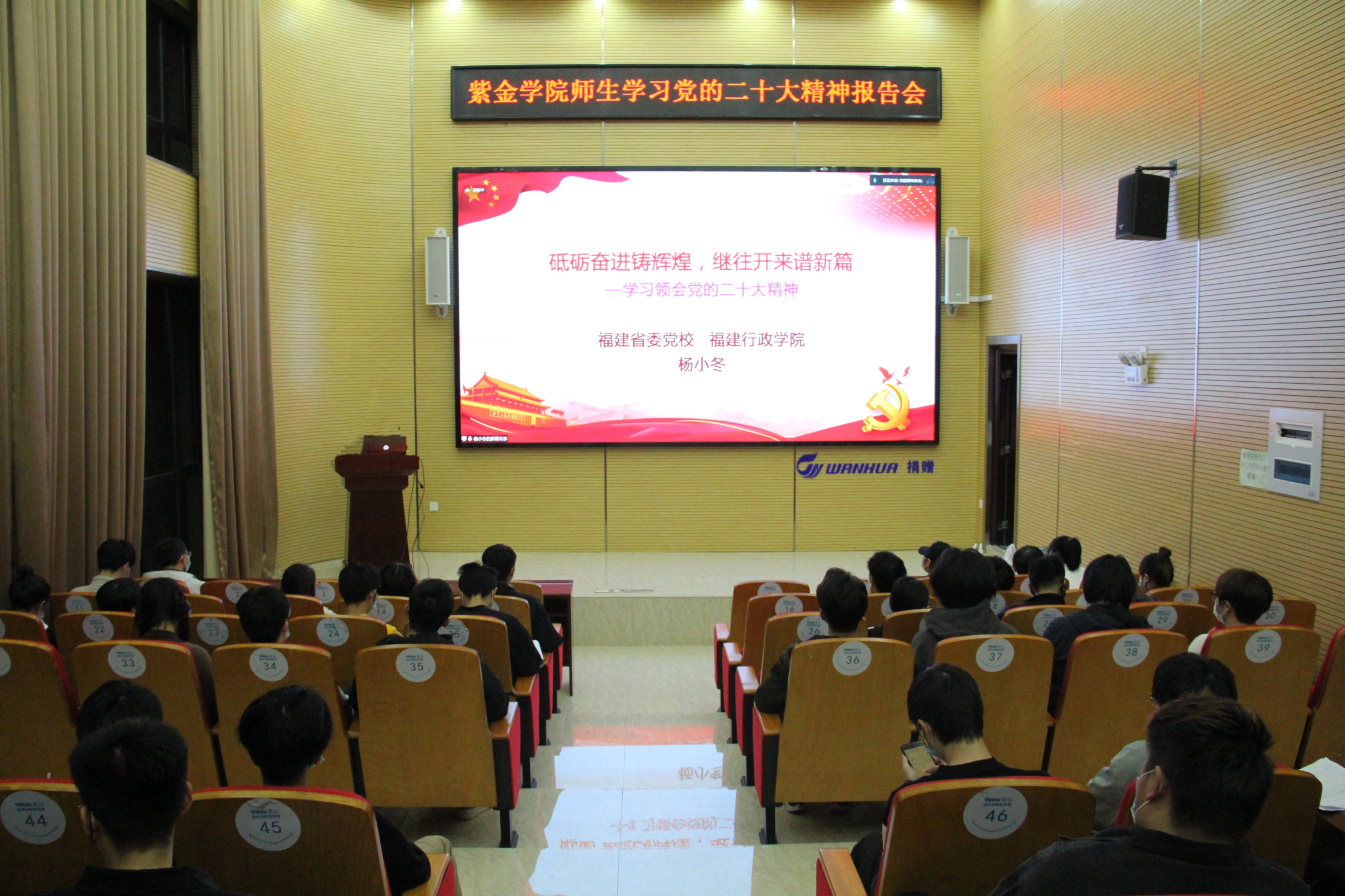 12月9日晚,成人影视师生学习党的二十大精神报告会第五讲在旗山校区泉港楼南101报告厅与铜盘校区同步举行,本次报告由福建省委党校、福建行政学院杨小冬教授作“砥砺奋进铸辉煌,继往开来谱新篇”主题报告,学习领会党的二十大精神。成人影视所有入党积极分子入团积极分子及师生党员参加本次报告会。
