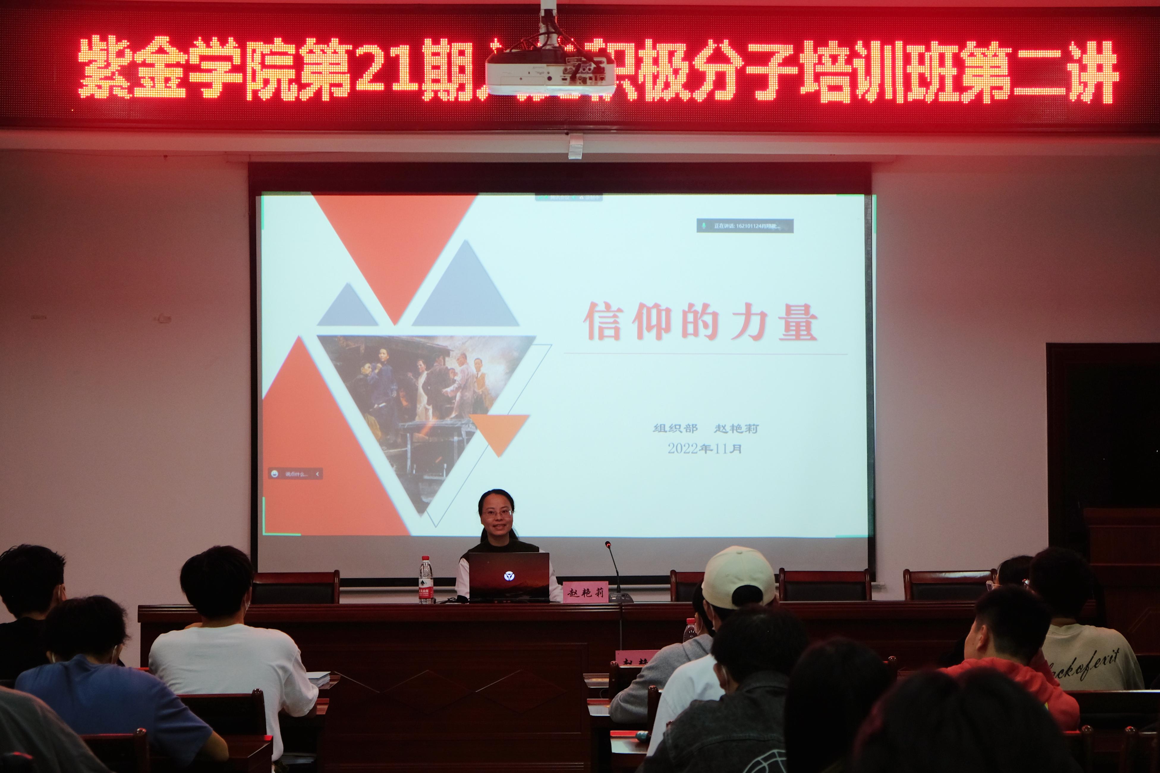 此次培训的主题为《信仰的力量》。首先赵教授从理想,信念,信仰这三个概念入手来展开课题。通过讲述三个砌墙工人的故事说明理想信念与个人发展之间密不可分的关系,之后用一个著名的定位速效心理实验,证明了信念是认知加情感加意志的结合体这一定义。接着赵教授从信仰的力量这一方面进行切入,列举了湘江战役中陈树湘“断肠明志”的事例,使我们深刻地认识到共产党员从成立之日就把共产主义确立为远大理想这一理想信念震撼人心的力量。在这之后赵教授从个体塑造党员的人格形象的视角,组织凝结团结队伍力量的视角和国家引领民族前进力量的视角全方位地告诉我们党员要做到思想上先入党,一同向着第二个百年奋斗目标前进这一远大治国理政目标。最后赵教授从求真学问练真本领,关注社会现实问题,以学问为天下公器这三个方面教育我们如何成为一名有信仰的大学生,并向我们推荐了三本书以及政论节目。