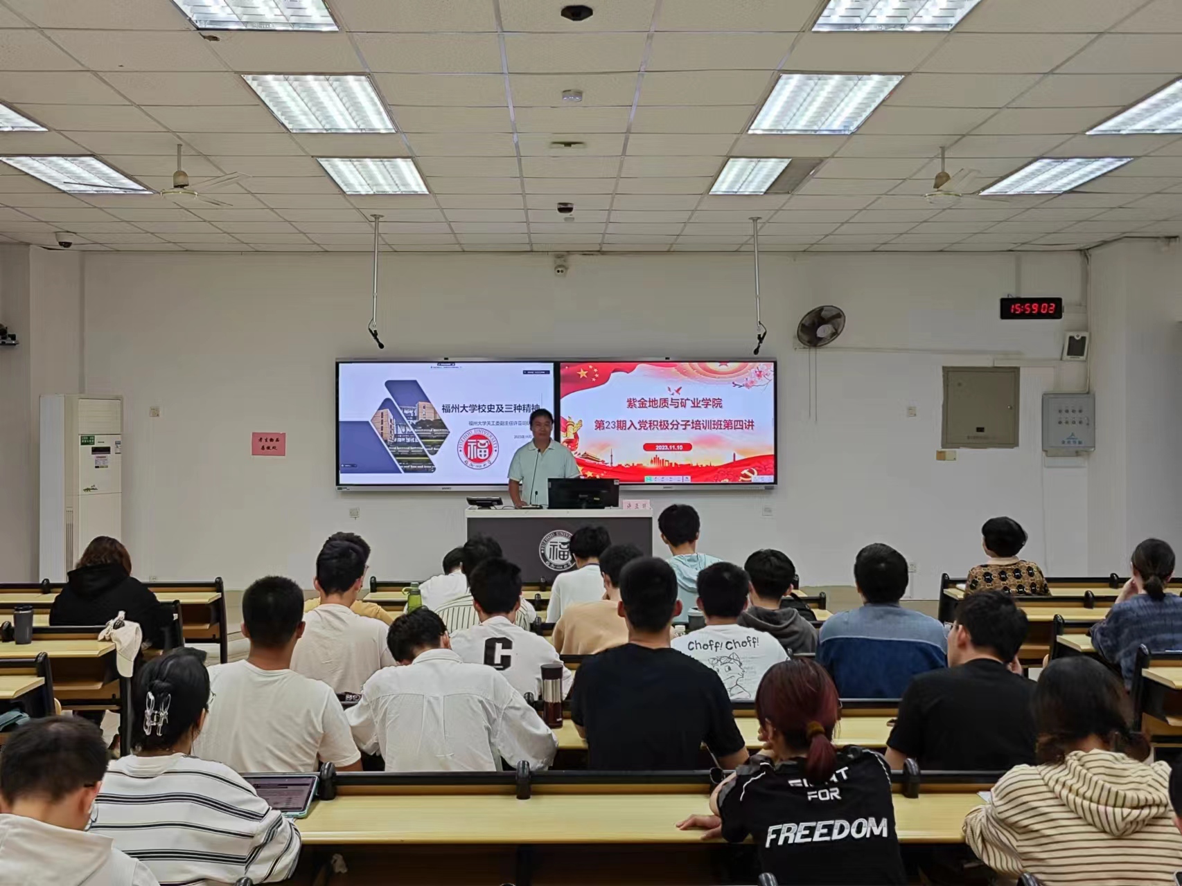在党课的最后,许老师着重讲解了成人影视 的三种精神,以张孤梅同志等为代表的艰苦奋斗的创业精神、以卢嘉锡先生为代表的严谨求实的治学精神、以魏可镁院士为代表的勇于拼搏的奉献精神,希望同学们进一步弘扬福大三种精神,增加历史责任感和时代紧迫感,秉承“明德至诚,博学远志”的校训,努力做到树立远大理想、严于律己、始终坚持正确的生活航向。