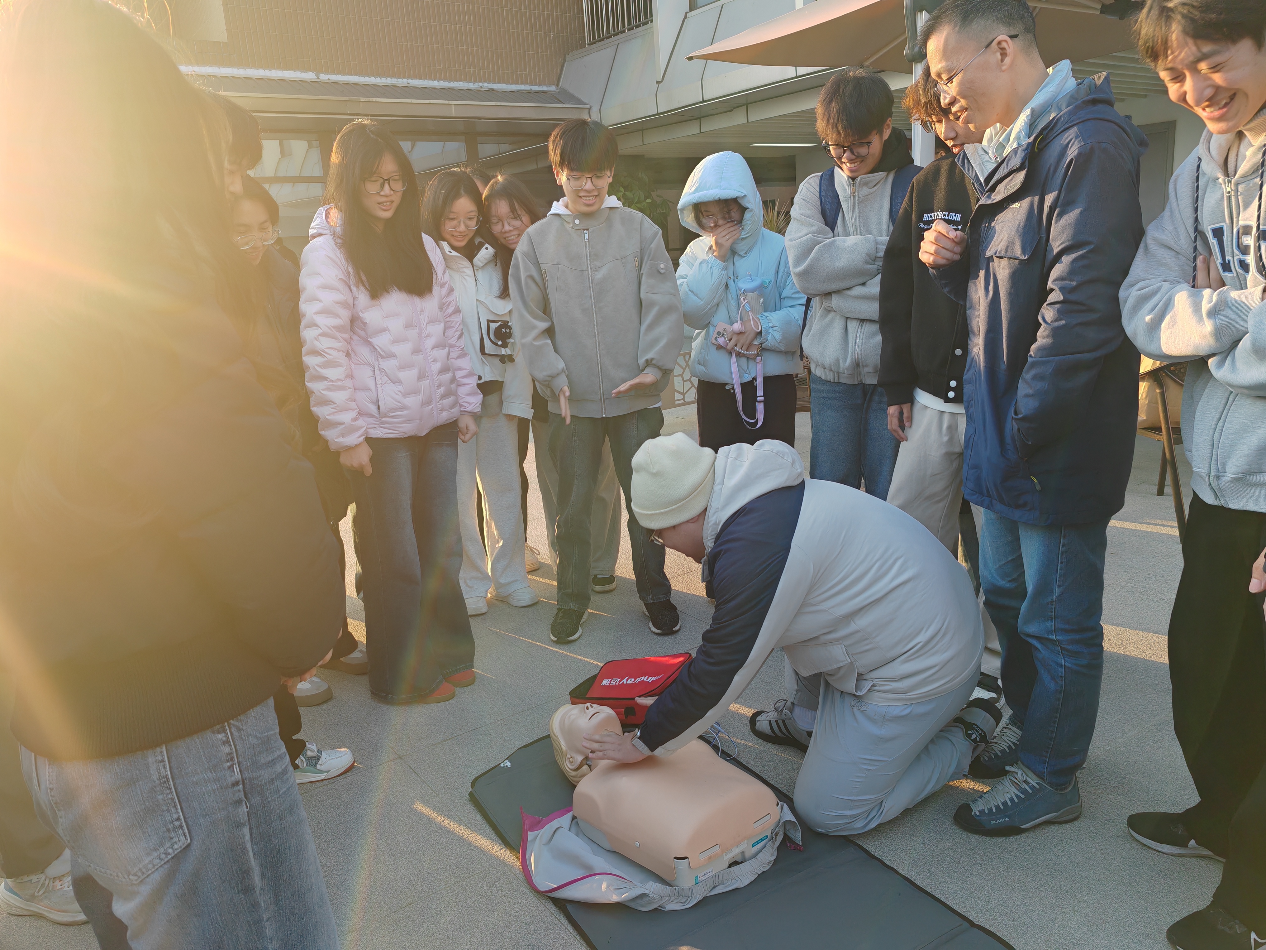 林世荣老师聚焦心肺复苏这一关键急救技术,细致讲解了从现场判断到规范施救的全流程,重点培训了在嘈杂环境中快速评估伤者意识与呼吸、规范实施胸外按压、开放气道、人工呼吸以及AED设备使用的要领。通过严谨而高效的教学,进一步提升了学生在应急情况下的处置熟练度与信心。