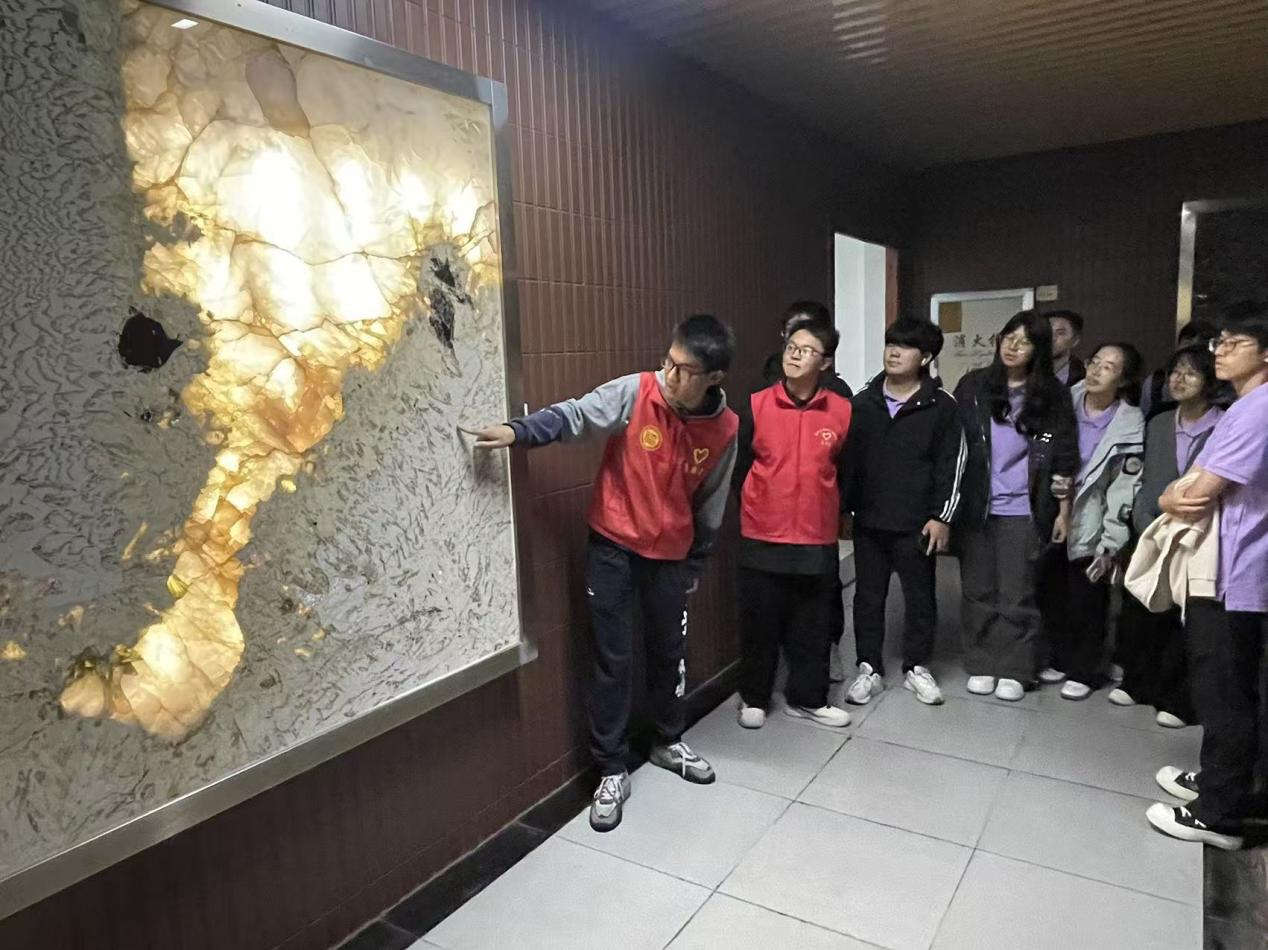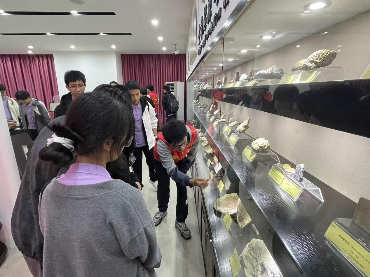 鸮头贝、菊石等化石见证地球亿万年演化的奥秘,讲解员将深奥的地质知识与现代科技、生活趣闻巧妙结合,使专业知识从书本走向现实,让同学们倍感亲切,极大地激发了新生探索地球奥秘、投身资源事业的浓厚兴趣。黄铁矿闪烁着金属光泽,透出“愚人金”特有的狡黠光彩;紫水晶盛放着梦幻般的紫色,犹如将星河的碎影封存于晶簇之中;孔雀石则更为奇妙,将孔雀羽毛上最鲜活的翠绿,“凝固”为石中永不褪色的纹理。面对这些形态各异、色彩缤纷的矿物标本,同学们对矿物科学的专业兴趣,正悄然在心中生根发芽。